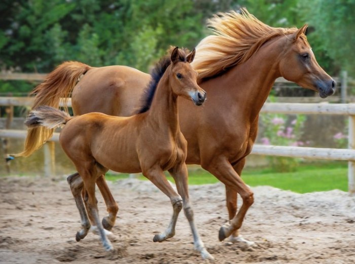 Âge : Les poulains naissent petits, pesant généralement environ 10 % du poids de leur mère. Ils croissent rapidement, les weanlings (poulains sevrés) gagnant 0,9 à 1,1 kg par jour. Les yearlings (chevaux de un an) devraient atteindre environ 50 % du poids adulte, et la plupart des chevaux sont pleinement musclés vers 4 ans.